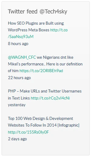<?php /* Plugin Name: Twitter Tweets Widget Plugin URI: http://code.tutsplus.com Description: Displays latest tweets from Twitter. Author: Agbonghama Collins Author URI: http://tech4sky.com */